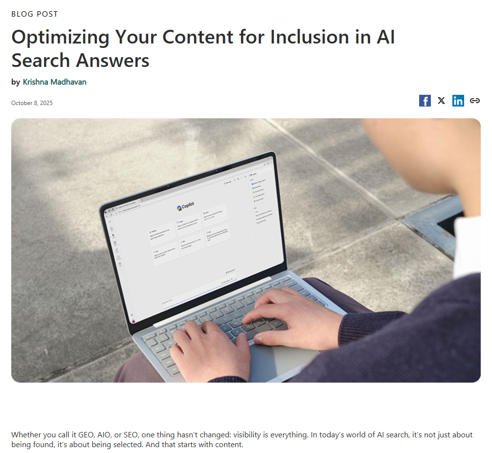 Quelqu’un chez Microsoft s’est dit que ce serait une bonne idée de produire des recommandations pour créer des contenus adaptés pour être réutilisés comme sources de réponse dans ce type de fonctionnalités (sur Bing, mais aussi sur Google, Perplexity, SearchGPT …)