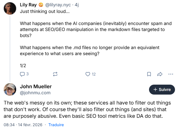 - Google & Bing: Markdown Files Messy & Causes More Crawl Load (Search Engine Roundtable, Février 2026) :
