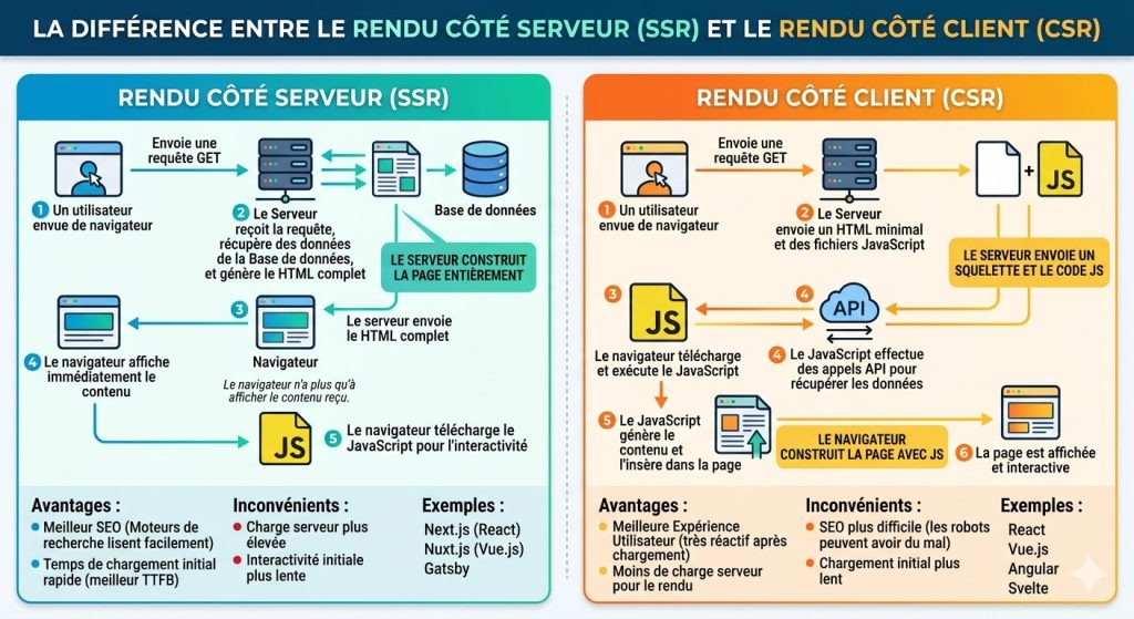 Server-Side Rendering (SSR). Le rendu côté serveur consiste à exécuter le JavaScript sur le serveur avant d’envoyer le HTML au client (et à Googlebot). L’appel API est effectué côté serveur, et la réponse est intégrée dans le HTML initial. Si l’API échoue, le serveur peut appliquer une logique de fallback (contenu de secours) : servir une version cachée, afficher un contenu par défaut, ou renvoyer un code HTTP approprié. Les frameworks comme Next.js, Nuxt.js ou Angular Universal supportent nativement ce pattern.