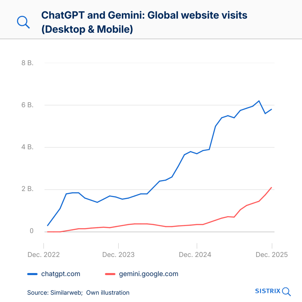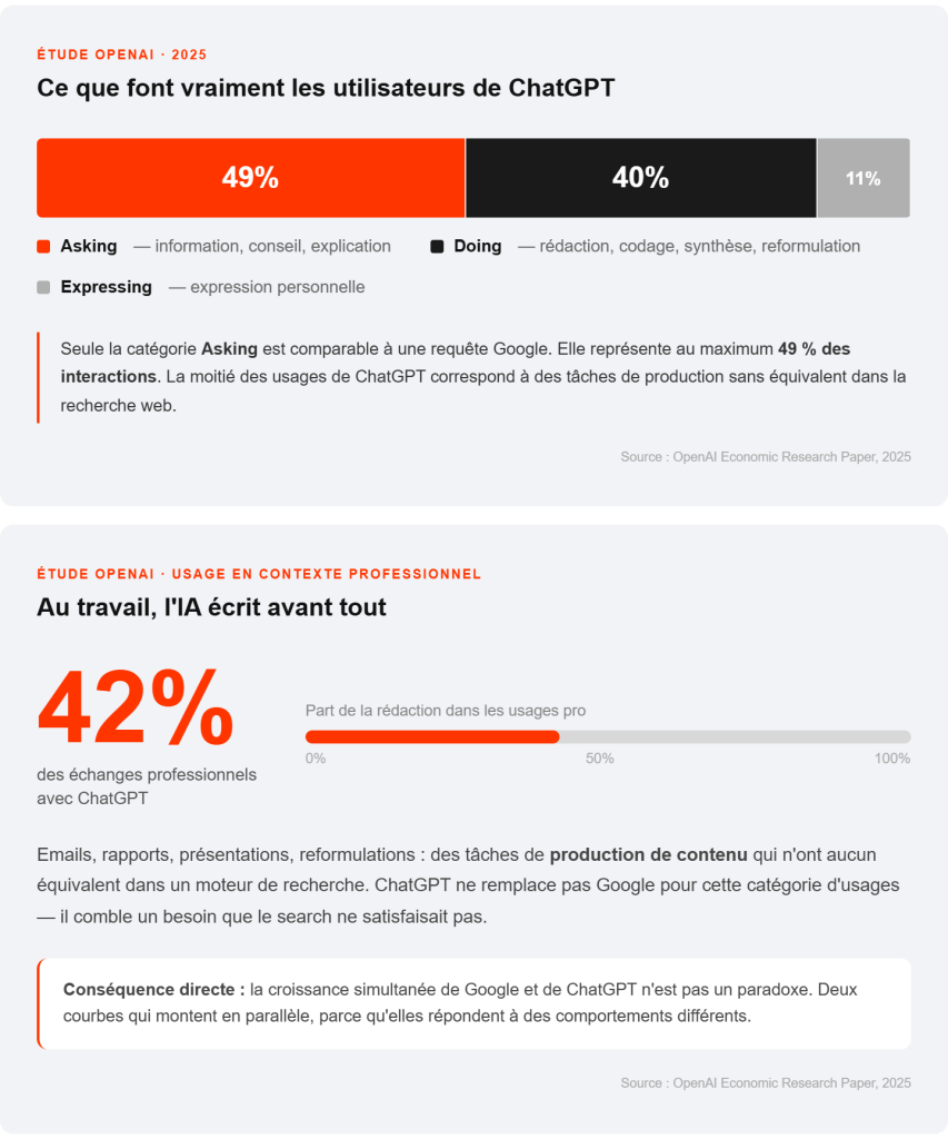 La conséquence est directe : quand un utilisateur demande à ChatGPT de transformer des notes en email, de corriger un rapport ou de générer du code, il ne remplace pas une requête Google. Il accomplit une tâche que Google ne permettait pas d’exécuter. Ce volume d’usage vient en addition, pas en substitution. C’est ce que les données SimilarWeb confirment au niveau du trafic : deux courbes qui montent en parallèle, pas une qui monte pendant que l’autre descend.
