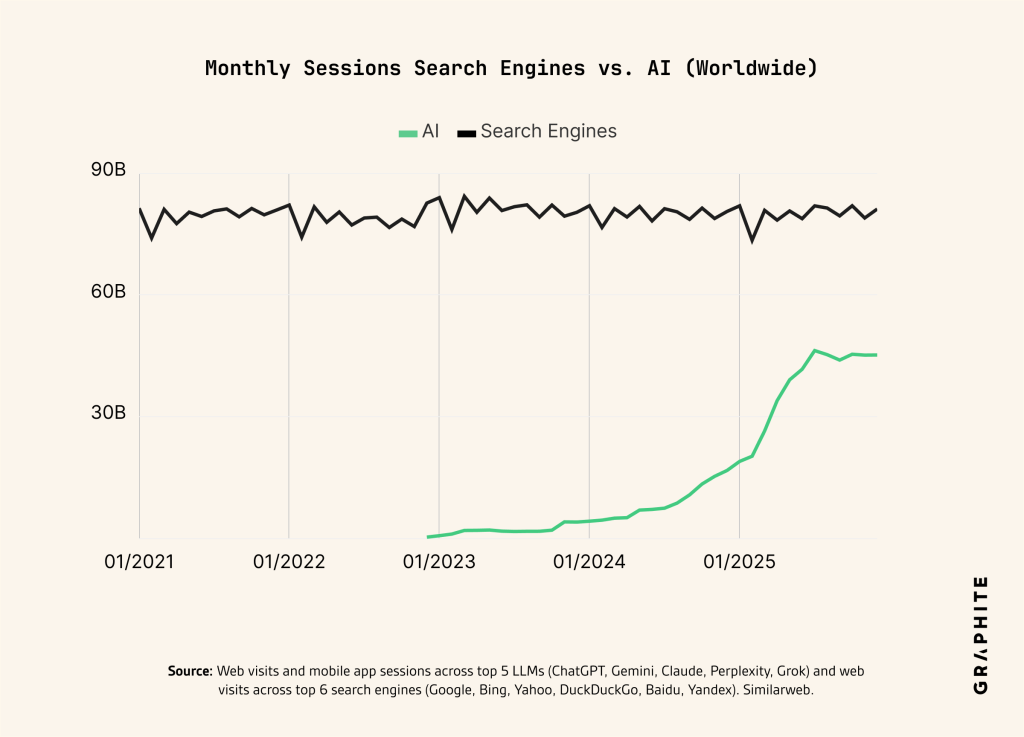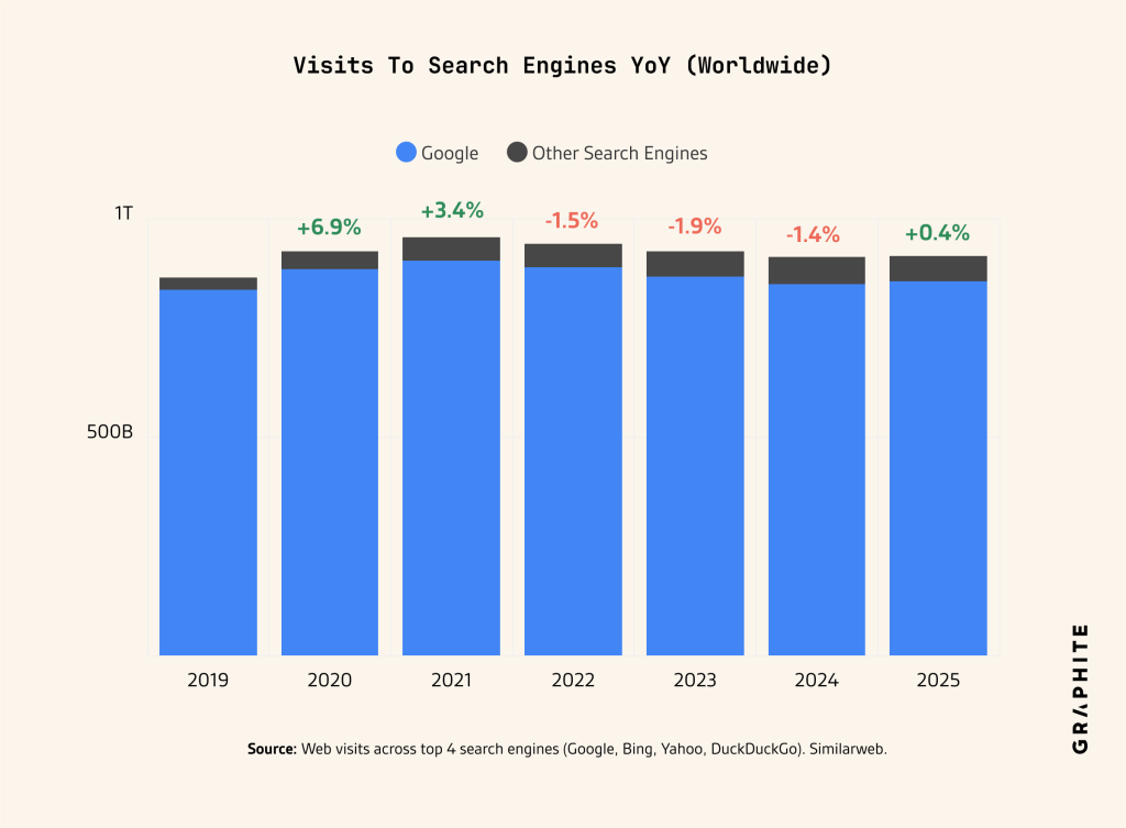Les données SimilarWeb compilées par Ethan Smith (Graphite.io) posent un fait qui devrait clore le débat avant qu’il ne commence : le trafic de Google n’a pas baissé pendant que celui des outils d’IA générative augmentait. Les deux ont progressé simultanément. L’IA n’a pas prélevé des parts sur Google — elle a généré une demande supplémentaire, sur des usages que le search classique ne couvrait pas.