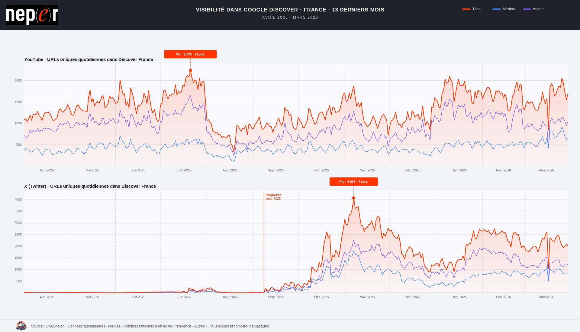 La plateforme vidéo était présente dans le feed français avec une base stable de 1 000 à 1 500 URLs uniques quotidiennes (nombre de posts ou vidéos distincts détectés dans le feed) détectées dans l’échantillon. En six mois, X a non seulement comblé cet écart, mais l’a effacé sur plusieurs indicateurs clés. Les données de 1492.vision, collectées quotidiennement sur le marché France d’avril 2025 à mars 2026, permettent de documenter précisément cette bascule.
