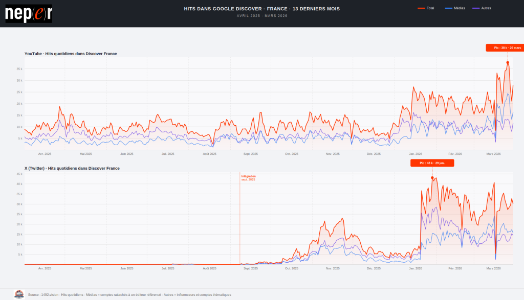Un point que les comparaisons relatives entre X et YouTube peuvent masquer mérite d’être signalé. La montée en puissance de X ne s’est pas faite au détriment de la portée absolue de YouTube. La plateforme vidéo affiche au contraire sa plus forte progression sur les hits en janvier-mars 2026, atteignant des niveaux quotidiens inédits sur l’ensemble de la période analysée (pic à 37 751 hits le 26 mars 2026, contre une moyenne de 10 657 en avril 2025).