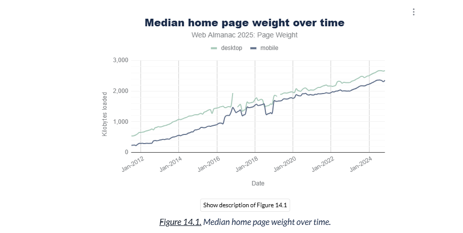 La croissance n’est pas linéaire : elle s’accélère. Le poids médian mobile a progressé de 8,4 % entre 2024 et 2025. Au 90e percentile, les pages dépassent les 10 Mo sur desktop.