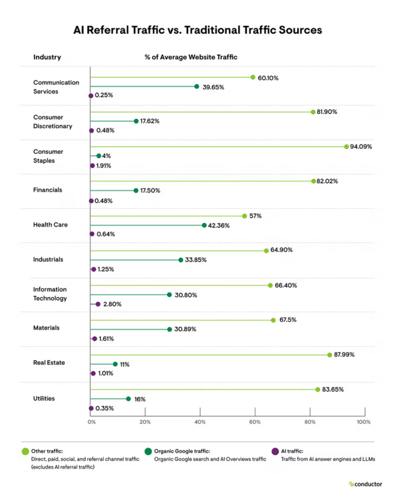 Les données du rapport Conductor AEO/GEO Benchmarks sont sans appel : en moyenne, le trafic référent envoyé par les outils d’IA représente 1,08 % du trafic total d’un site, tous secteurs confondus. Le secteur le mieux loti, l’IT, atteint 2,80 %. A comparer avec le trafic organique Google, qui représente entre 30 % et 94 % selon les industries. On parle d’un rapport de 1 à 30 dans le meilleur des cas, et de 1 à 375 dans le pire.
