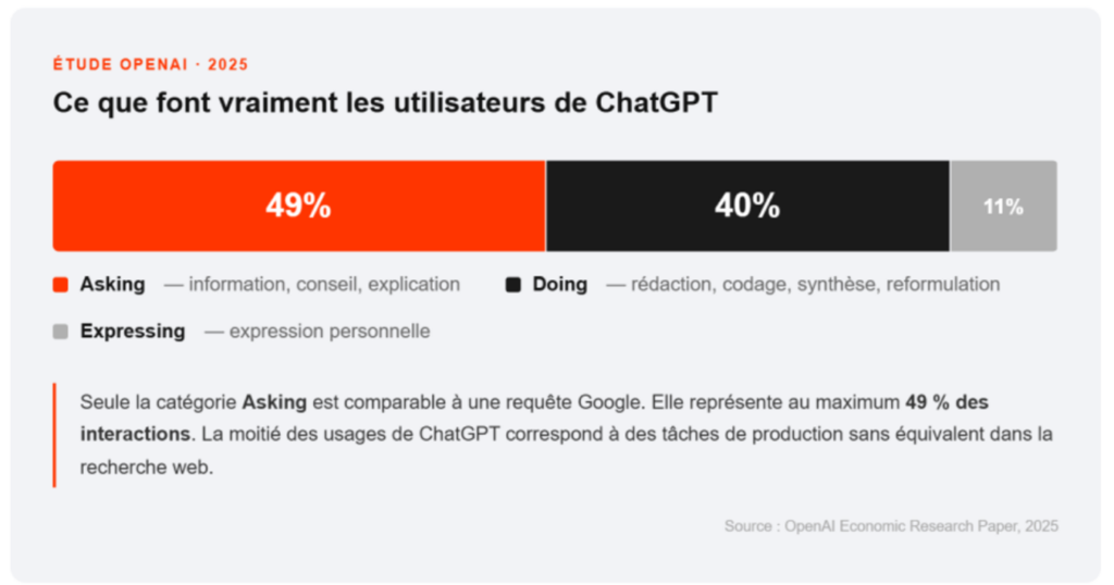 L’étude interne d’OpenAI sur les usages de ChatGPT, publiée en 2025, le confirme par un autre angle. Seuls 49 % des échanges avec ChatGPT relèvent de la catégorie « Asking » (recherche d’information, conseil, explication), la seule catégorie comparable à une requête Google. Les 40 % qui suivent concernent des tâches de production (« Doing » : rédaction, codage, synthèse, reformulation) et 11 % de l’expression personnelle (« Expressing »). Autrement dit, plus de la moitié des usages de ChatGPT n’ont aucun équivalent dans un moteur de recherche. On ne parle pas de substitution, on parle de création d’un nouvel usage.