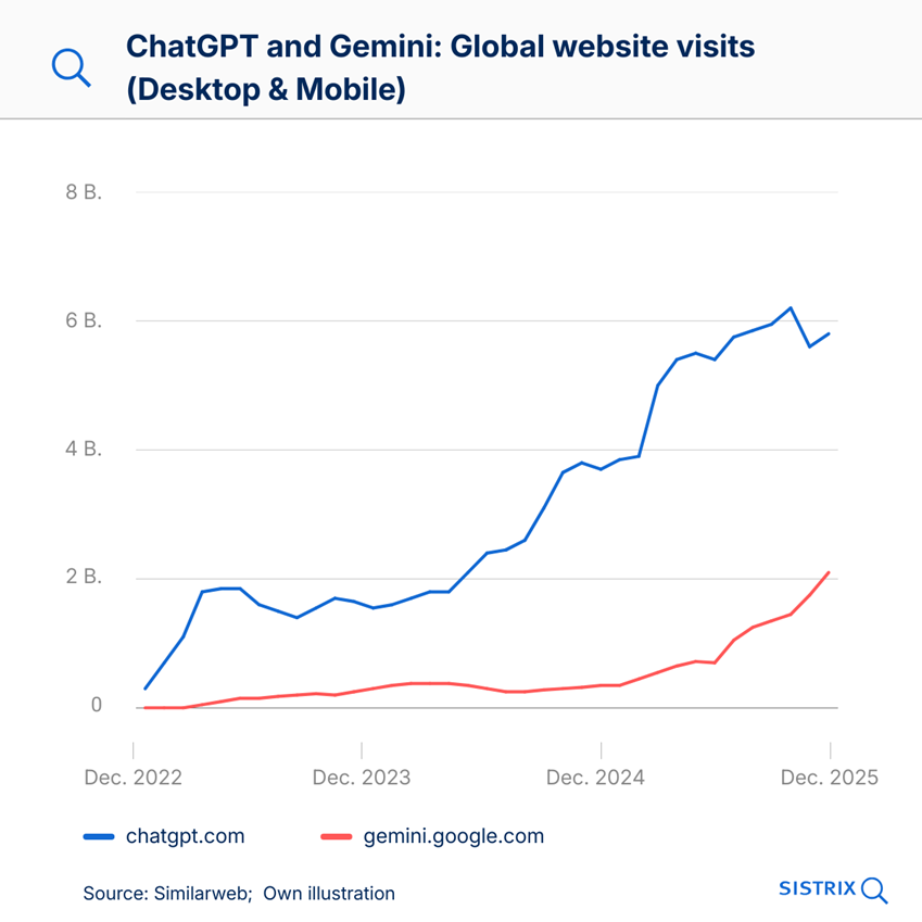 Gemini progresse rapidement en parts de voix tandis que la croissance de ChatGPT en nombre de visites marque le pas. Google dispose de ses propres modèles d’IA désormais régulièrement placés dans le trio de tête des benchmarks, seul Anthropic et Claude continuant à les devancer sur certains critères. Google possède surtout un actif stratégique que tous ses concurrents envient : son index web. Sans accès à un index de cette qualité, ChatGPT Search, Perplexity et les autres ne peuvent pas fonctionner correctement. Google dispose aussi d’un modèle économique viable (quand OpenAI peine encore à lancer la publicité sur ses outils), d’une indépendance relative vis-à-vis de Nvidia (quand ses concurrents dépensent trois à cinq fois plus pour leur infrastructure), et surtout de la capacité à imposer les usages IA directement à ses milliards d’utilisateurs existants via les AI Overviews, le mode IA, et demain un moteur de recherche entièrement repensé pour l’IA.
