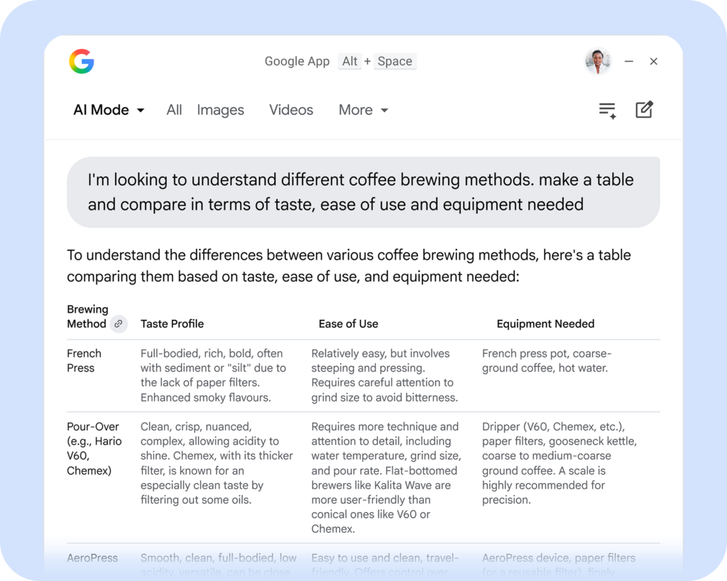 - AI Mode : en basculant dans ce mode, l’application fournit des réponses synthétisées et conversationnelles générées par les modèles Gemini de Google, avec possibilité de poser des questions de suivi. Les résultats incluent des liens vers des sources web, mais la réponse primaire est générative.