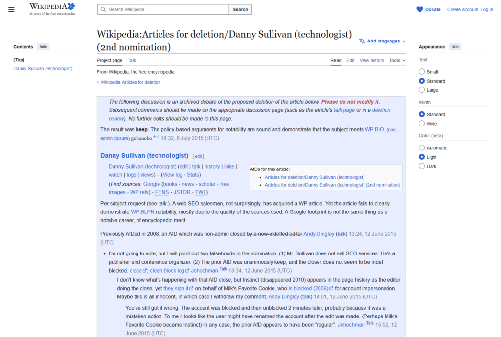 - Wikipedia Puts Danny Sullivan’s Article Up For Deletion – Search Engine Roundtable, juillet 2015
