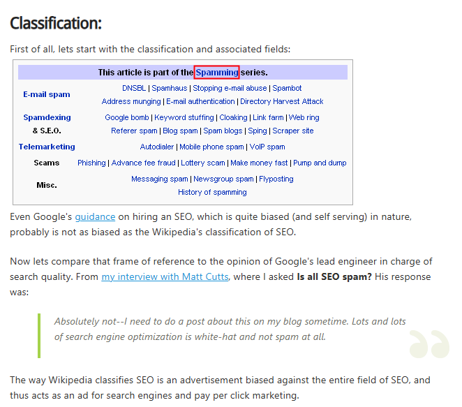 Un vieil article de SEOBook datant de 2006 commentant la page en anglais de Wikipedia sur le SEO :