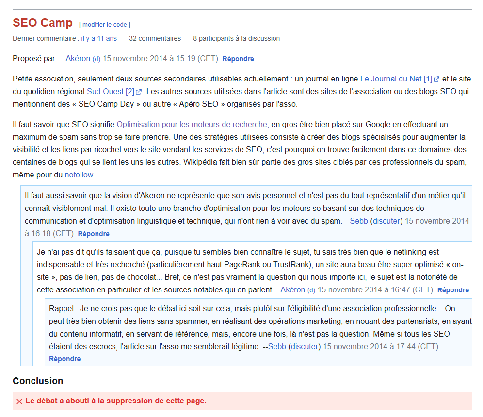 En règle générale, il faut bien le noter, la communauté francophone qui gère Wikipedia s’est un peu calmée contre les SEOs. Mais cela n’a pas toujours été le cas : le dinosaure du SEO que je suis se souvient de la discussion sur la page SEOCamp (finalement supprimée), où les arguments ont volé bas.