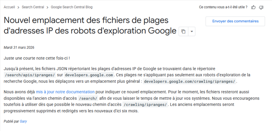 Le 31 mars 2026, Google annonçait le déplacement des fichiers JSON listant les plages d’adresses IP de ses crawlers, de /search/apis/ipranges/ vers /crawling/ipranges/ sur developers.google.com.